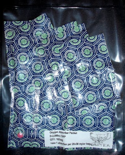 Each Bag contains 10 - 2,000cc oxygen absorbers made by OxyFree with indicator freshness pill/eye. When used with proper packaging and sealing, the oxygen in the packaging is greatly reduced. Our absorbers bring the oxygen level down reliably to .01% or less. These Absorbers are perfect when combined with 5-6 gallon Mylar Bags. The benefits of using oxygen absorbers are as follows: * Significantly improves keeping qualities of polyunsaturated fats and oils